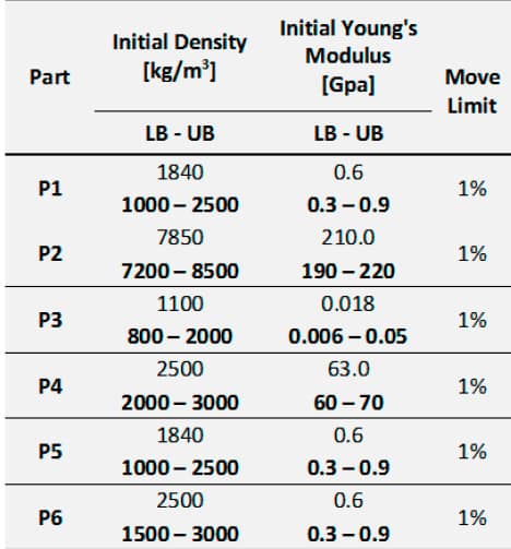 The parameterization of the FE model of the experimental setup is introduced to demonstrate the applicability of the proposed FE model updating method. The parameterized model consists of six parts (Figure 9). At each of these parts, the Young’s modulus and density are used as design variables. Thus, the final number of the design parameters is 12 variables. Table 2 presents the initial values that have been set in each parameter, which are identical to the nominal FE model’s upper and lower limits, which were selected to be used for the optimization process. The last column of the table shows the step of design, which is set at 1% of the respective previous value for all cases. The FE model is updated using the lowest six identified modal frequencies and mode shapes shown in Table 1. The identified mode shapes include components at all four sensor locations.