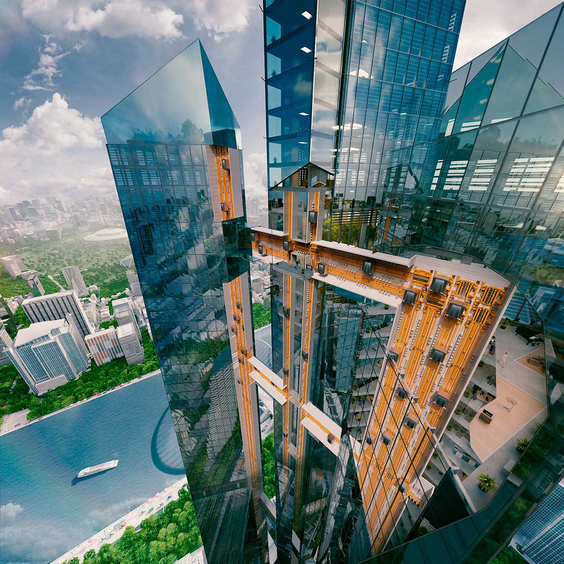 Looking beyond applications to improve passenger throughput and elevator efficiency in singular tall buildings, MULTI’s mass- transit approach means that multiple buildings and structures can be connected across skybridges or via underground tunnels. This could be an attractive option for unprecedented accessibility and connectivity within low-rise building complexes or buildings with unique geometries, such as the Dubai Frame (U.A.E.), the Interlace (Singapore) or so-called “landscrapers,” buildings with very large footprints, their lengths comparable to skyscrapers’ heights.