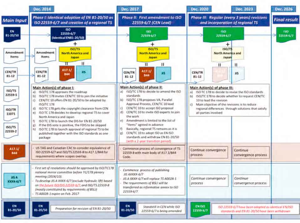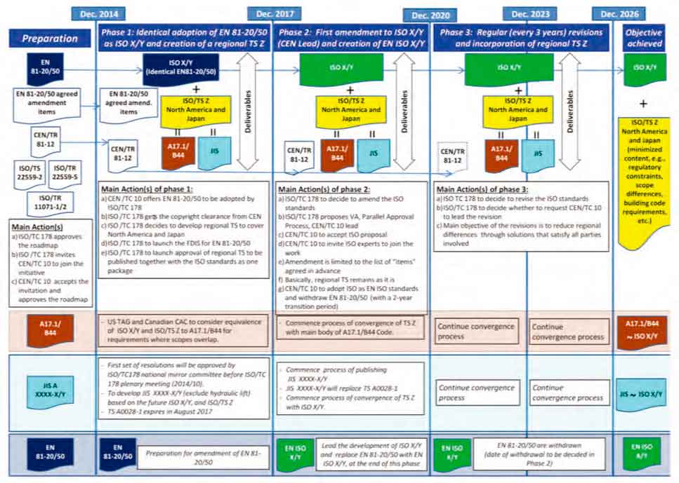 “USA and Canada will continue the convergence process by aligning the content of ASME A17.1/CSA B44 and ISO X [ISO 8100-1] and ISO Y [ISO 8100-2], where the scopes overlap, thus reducing the content of ISO TS Z [ISO 8100-3].