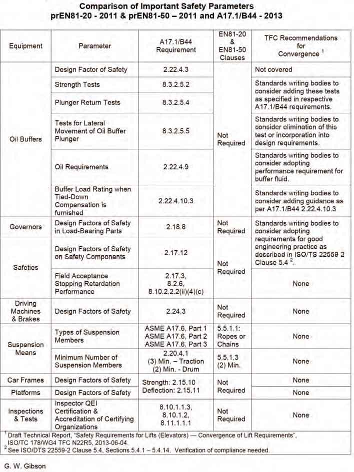 Task-force members of ISO TC 178 developed tables of differences between the codes. One from Mr. George Gibson, former chairman of the Mechanical Design Committee, is shown as Table 1. This table identifies significant prescriptive differences with suggestions of doing nothing or actively pursuing changes to harmonize the codes. With the advent of the cut and paste of EN 81 into ISO 8100, these future changes are now left to the vast EU majority to accept or deny without any consensus.