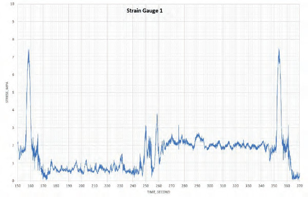 The systematic, consistent and repeatable behavior of the traces when the step was run on the main side (passenger side) and return side (non-passenger side) of the escalator can be quickly recognized from the data in Figure 2. Each complete step revolution in the escalator is well-defined and recognized. Although the traces are dependent on the specific locations of the gauges mounted in the step, the data/traces give fingerprints to the nature and quality of the path that the step is passing through in the escalator. The traces clearly show the regions of high and low stresses to which a step in the step band is subjected while running in the escalator. It can be deduced that the data from the smart step truly reflect occurrences inside the escalator.