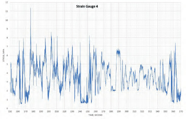 Figure 2 shows data of traces for nine strain gauges, which were wirelessly downloaded from the smart step to a computer after running the escalator for more than 15 min. Strain Gauge 2 developed a malfunction; therefore, its data have been ignored.