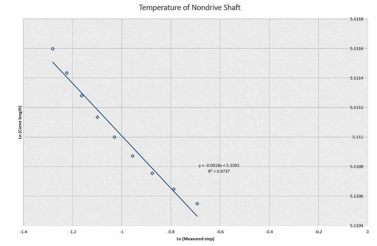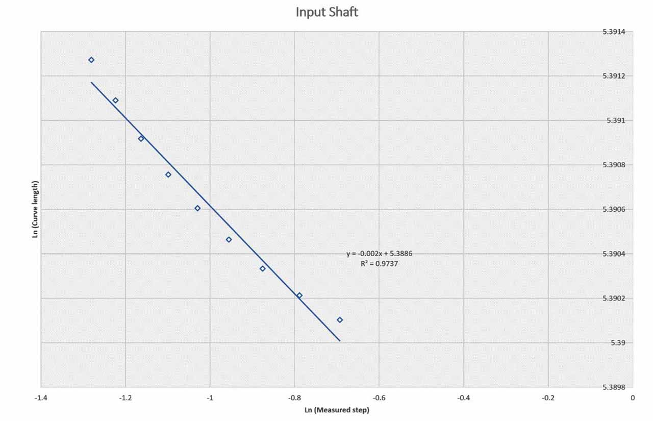 Table 1 and Figures 4, 5, 6, 7 and 8 present the fractal dimension values for the traces of the measured temperatures from different locations in the gearbox. The roughness of the traces in Figure 3 shows that, in general, they are smooth, except some drops out in the signals. Table 1 lists the estimated fractal dimension values for the traces. The values reconfirm that all of the traces are smooth, except there are very small variations, which could have been developed as result of the drop outs. The period between 4000-10,000 s has shown higher fractal dimension values than the period 0.0-4,000 s. This could be due to the escalator shutting down, as shown in Figure 2.