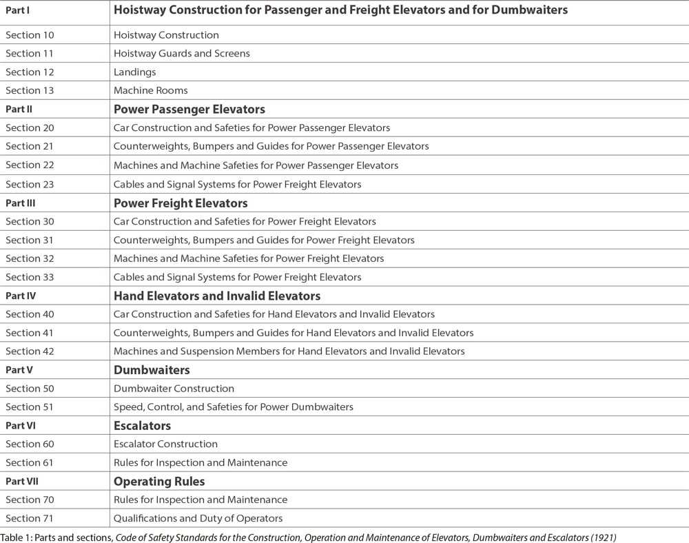 The first edition (A Code of Safety Standards for the Construction, Operation and Maintenance of Elevators, Dumbwaiters and Escalators: 1921) established the organizational structure, followed by the next two editions. The authors apparently utilized a numbering scheme predicated on a simple set of guidelines using the decimal system. (Note: the origins of this scheme remain a mystery.) This system worked hierarchically: each part of the code was assigned a single-digit number, each section was assigned a two-digit number, and each rule was assigned a three-digit number. The system utilized the three-number system as follows: the first number of a rule indicated the part of the code, the first two numbers combined indicated the section, and the third number indicated the rule number. For example: “Rule 111: Protection of Hatchway Openings” was found in Part 1, Section 11, and was the second rule in that section (Rule 110 being the first rule). This system allowed up to 10 sections per part and 10 rules per section. However, as none of the three code editions utilized the maximum number of allowed sections, and most sections had fewer than 10 rules, the code appears, at first glance, to employ a somewhat arbitrary numbering system. This is further reinforced by the fact that the code parts were assigned Roman numerals, and the sections and rules were assigned Arabic numerals (Table 1).