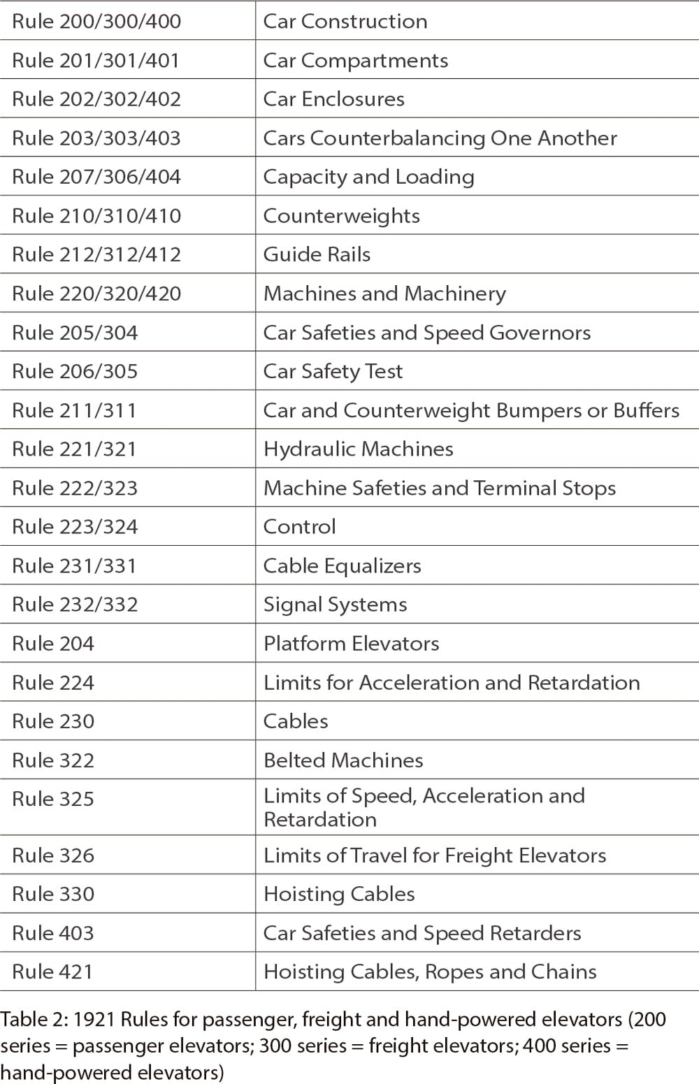 The code’s first edition included 99 rules concerning elevator and escalator installation and operation. The robust editorial character of these rules is indicated by the fact that the second edition (Engineering and Industrial Safety Standards: A Safety Code for Elevators, Dumbwaiters and Escalators: Rules for Construction, Inspection, Maintenance and Operation: 1925) also had 99 rules, 95 of which were carried over from the first edition. The content of the rules “deleted” from the first edition was incorporated into other rules, and the additions addressed safety issues (new rules for rated capacity tests for passenger and freight elevators) and the increasing use of escalators (new rules concerning testing and machine rooms). Many of the rules were also revised (to varying degrees) in the new edition, and the editorial efforts were primarily aimed at greater clarity and a more precise use of language.