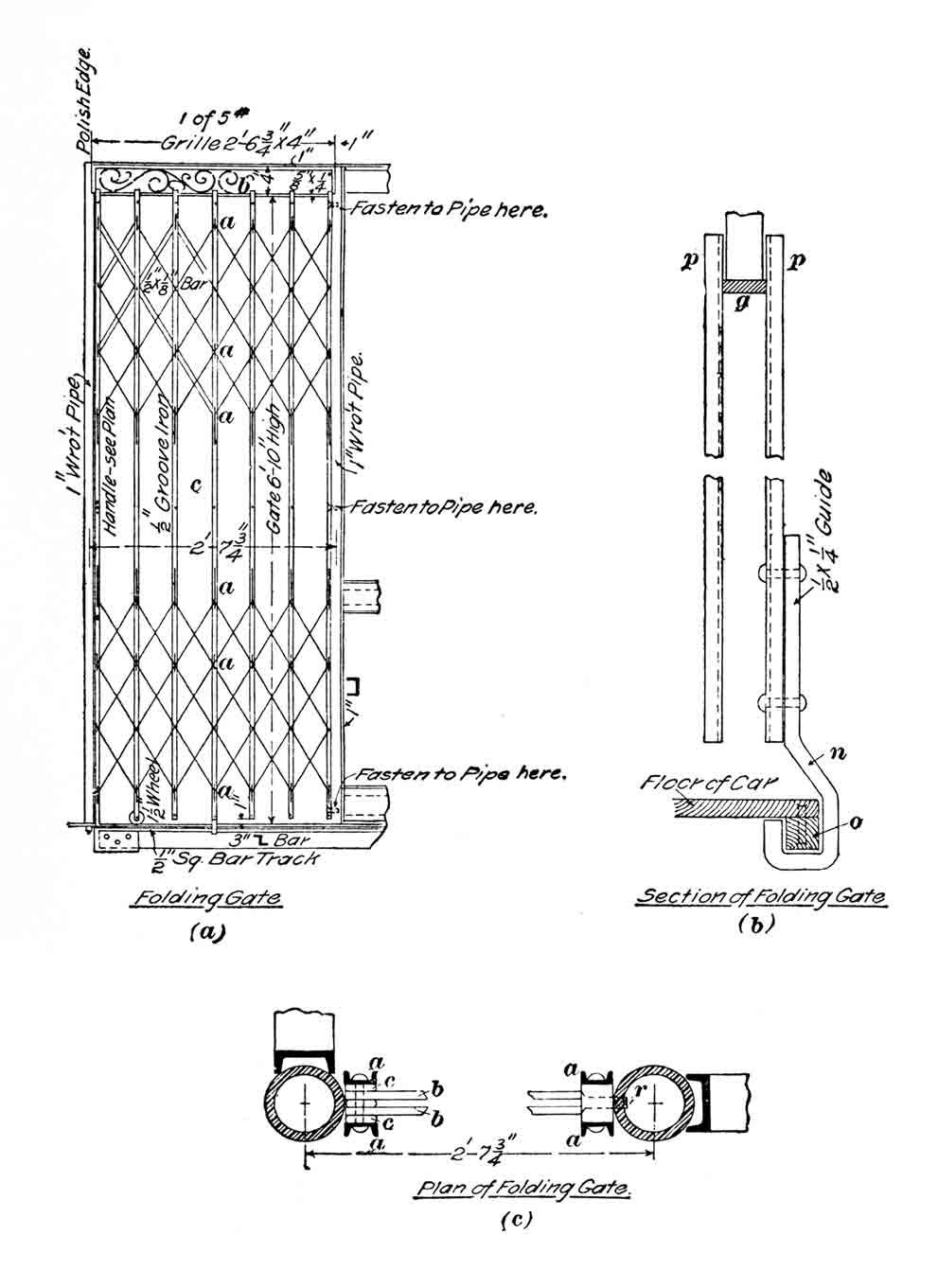 “An elevation of the sliding or folding gate, protecting the entrance to the car, is shown in Fig. 3a, while Fig. 3b shows a large-scale detail of the bottom of the sliding post of the gate n and the guide o in which it slides. The vertical members of the gate are each composed of a pair of 1/2-in. channels as shown at a in Fig. 3c, which is an enlarged plan. Between these channels, the diagonal lattice bars b are secured as shown, with washers c between them to prevent their rubbing together as the gate is opened and shut. The rivets securing this latticework to the channels are not driven tight but are left sufficiently free to play up and down in the slotted openings shown in the elevation, Fig. 3a, at a. Thus, the gate, which effectively bars the 2-ft., 7-3/4-in. opening in the car, occupies, when open to its fullest extent, only the width of the seven vertical channels, or 3-1/2 in. On the exterior channel, a 1/2- X 1/4-in. guide is riveted, as shown at n in Fig. 3b, and on the underside of the Z-bar flange, a track o is secured for the guide to travel in. At the top of the gate, the 1/2-in. channels are carried up each side of the frieze grille of the car, as shown at b in Fig. 3a, and also in Fig. 3b, where the lower bar of the frieze grille is shown at g and the side bars or channels at p.”