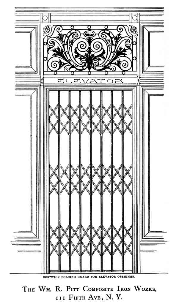 This description reveals the operational elegance of the Bostwick gate. Its visual elegance is seen in a 1902 advertisement for an elevator gate manufactured by William R. Pitt Composite Iron Works (Figure 4).