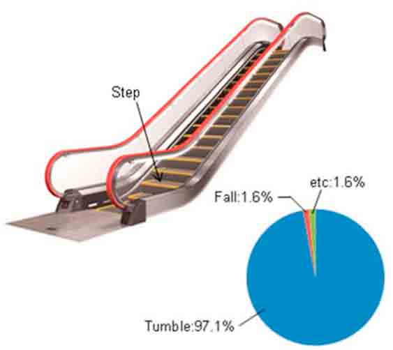 Escalators are important pieces of equipment that support the infrastructure of society. However, the number of accidents involving escalator passengers is not declining, and, in most cases, the causes are either tripping or falling. Manufacturers make every effort to strengthen safety design, but accidents have not been eliminated.