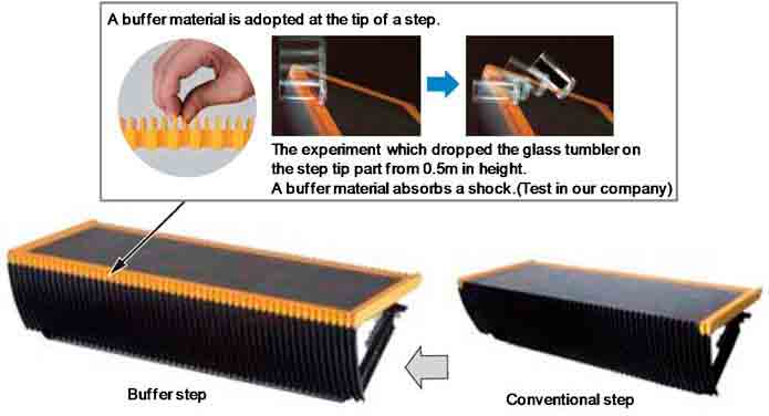 Conventionally, the steps used in escalators are formed by aluminum die-casting. The upper surface of each step typically has a yellow demarcation part made of plastic along three edges of the upper surface. Based on this conventional structure of steps, we added demarcation parts formed of a buffer material at the sharp angular part of the steps. By using this structure, in collisions with the sharp angular part of the step, where critical injuries are a major concern, the shock is eased, and injuries are reduced (Figure 2).