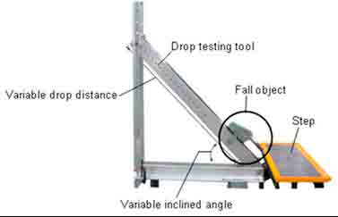 Although evaluation indexes, test methods, etc. are defined in the standards for impact-absorbing tiles, such as those used in parks, or collisions of cars, there are no standards for accidents involving falls on escalators. Therefore, to evaluate the injury-mitigation effect of a fall while using an escalator, we developed drop-testing equipment for imitating head collisions at the time of a fall (Figure 4).
