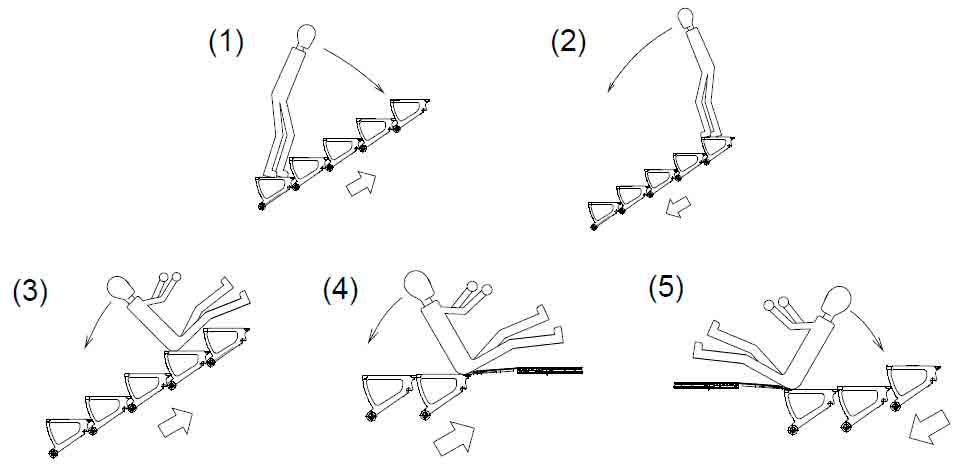 According to an investigation of escalator accidents, frequent falls involve “a fall to the upper floor at an inclined part,” which occurs in a sudden stop during upward movement, and the fall conditions at this time were determined as the evaluation index. A fall or tumble can mainly be classified into the following five categories, including the fall situation made into the evaluation index (Figure 6):