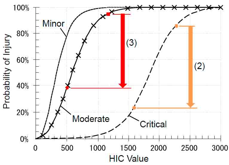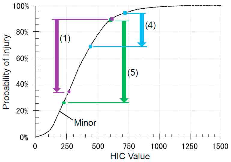 The probability of head damage, according to severity, can be estimated by applying the HIC value calculated from the collision acceleration to five kinds of injury risk curves shown in Figure 3. An injury risk curve is a curve that shows the relationship between injury probability and HIC value, and plots data showing the correlation between skull and cerebral damage based on physical examinations after actual accidents, etc. The injury probability is expressed with the vertical axis, and the HIC value is expressed with the horizontal axis.