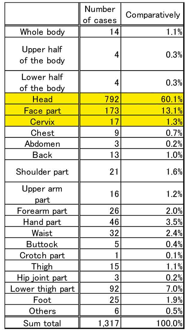 - A fall to the lower floor at an inclined part (After attaching fall on its backside, the head is bumped directly.)