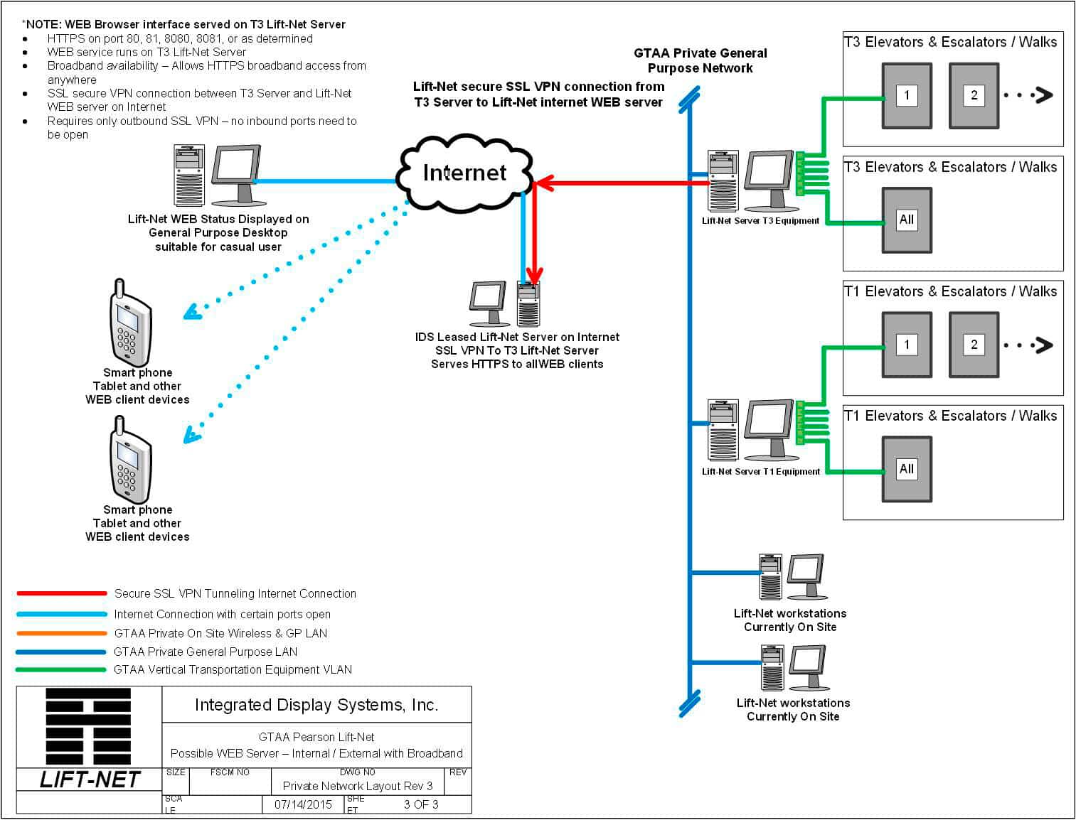 Those using Lift-Net web and IoT services are provided a special login on our secure HTTPS website. The Lift-Net computer on a web customer’s site will open a secure outbound connection using a special encrypted tunnel developed by IDS to our leased servers on the internet. The secure leased server will then send the real-time, service-mode and fault data to the customer’s individual pages on the Lift-Net website to be viewed using their secure login.