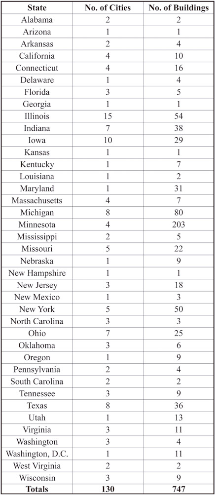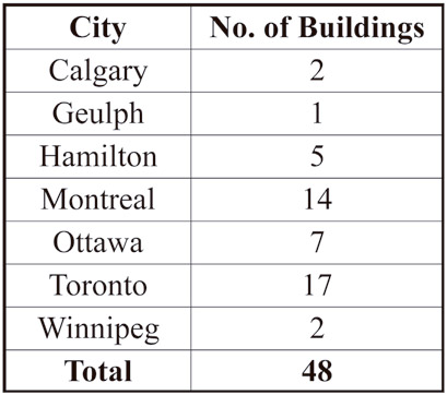 While the patent record speaks to a years-long design exploration, it does not shed light on the history of the company or provide insights into the commercial success of Miller and McKinney’s efforts. However, a 64-page 1924 company catalog included a list of customers. The section was described as “an incomplete list of buildings under positive signed contract or equipped with M-C-K safety locks.” This “incomplete list” was 38 pages long and included a detailed list of building names and locations accompanied by 49 illustrations of important buildings that employed the company’s safety. This material serves as evidence that Elevator Locks had a surprisingly strong national commercial presence. The company identified customers across much of the continental U.S. Its safety was employed in approximately 750 individual buildings in 130 cities. These were in 38 states and the District of Columbia (Figure 2). The cities ranged from the country’s largest urban areas, such as NYC and Chicago, to small-town America, represented by towns such as Knoxville, Iowa. The company had also successfully marketed its product in Canada, with 48 buildings in seven cities listed as employing the safety (Figure 3).