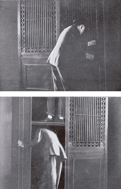 - Figure 4: (top to bottom) The waiting passenger safely peers through the gate in his attempt to locate the elevator car; the waiting passenger has opened an unlocked door to get a better view.