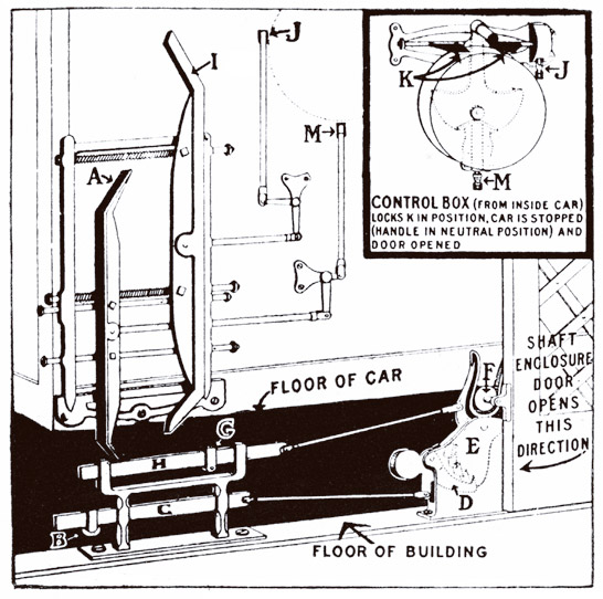 “Roller ‘F’ is attached to shaft enclosure gate and fits into rocker arm ‘E,’ which, in turn, is held back by lock ‘D,’ thus preventing [the] gate from being pulled back and opened. Lock ‘D’ does not release rocker arm ‘E’ until bar ‘C’ pulls it out of engagement, when roller ‘B’ engages with cam ‘A.’ However, cam ‘A’ does not make this engagement until rod ‘M’ moves, pushing it over the necessary distance. It will be noticed that rod ‘M’ is so adjusted to the operating lever that, when the car is stopped, the operating lever therefore in the neutral position, it automatically makes an engagement between cam ‘A’ and roller ‘B,’ which, in turn, releases lock ‘D,’ allowing rocker arm ‘E’ to swing back when the gate is opened. The shaft enclosure gate is not unlocked until the car is within the radius of cam ‘A,’ and the operating lever is in the neutral or stop position. When the elevator is at a safe landing, and the operating lever [is] in the neutral position, when the shaft enclosure gate is opened, rocker arm ‘E’ is shoved back by roller ‘F’ (which, as before mentioned, is attached to [the] shaft enclosure gate). This shoves bar ‘H’ to the left, bringing roller ‘G,’ which is attached to bar ‘H,’ into engagement with cam ‘I,’ thereby shoving it to the left. This moves rod ‘J’ upward, bringing the two arms ‘K’ (on inside of car) down on both sides of the operating lever so that it cannot be moved from its neutral position.”