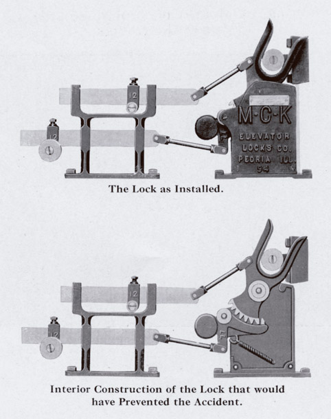 “Contained on the pages of this booklet are subjects of vital interest to anyone connected with the operation of a building or anyone having trouble with their present elevator system. It shows how your elevator may be protected without attaching to or interfering with the motive power that runs the car and contains a partial list of representative users in the U.S. and Canada. The M-C-K Automatic and Purely Mechanical Safety Lock, as illustrated, has proven the only combination of effective safety in the operation of an elevator and the only thorough and practical interlocking system ever offered the building owner and manager.”