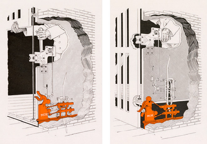 Elevator Locks illustrated the need for door safeties in its publication of two images that depicted the dangers of elevator operation. In the first, the curious waiting passenger safely peers through the gate in his attempt to locate the elevator car. In the second, the waiting passenger has opened an unlocked door to get a better view and is moments away from a fatal accident (Figure 4). The solution to preventing these accidents was, of course, the M-C-K Automatic Safety, and the catalog included a detailed description of its operation (Figure 5):