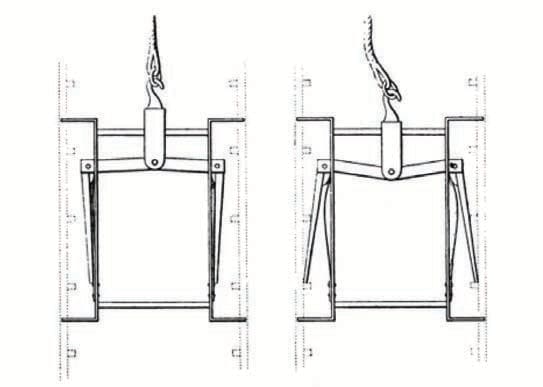 In December 1850, two articles appeared in the Practical Mechanic’s Journal on safety gears on pit cages in mining, which were also reproduced in Dingler’s Polytechnisches Journal with illustrations.[6] The first is entitled “Safety Platform and Self-Releasing Hook for Mine Hoisting Chutes,” and deals with a development by engineers White and Grant. If a rope or a connecting link breaks, an elastic spring presses toothed parts of roller surfaces against the wooden guide rails. This brings the platform to a standstill.