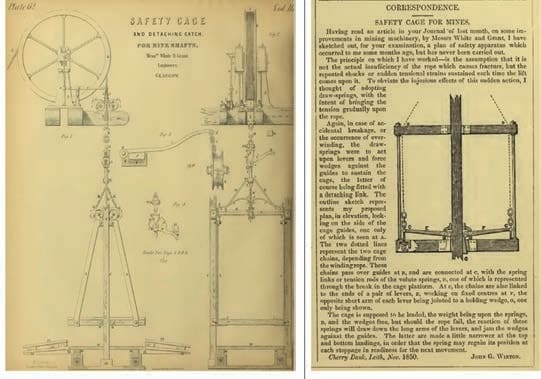 The second article reports on a “safety platform for mine shafts” by John Winton. Tension springs, which are intended to dampen excessive changes in tension in the suspension cables, act on levers in the event of a break in the suspension means, driving wedges between the guide rails and the platform so that the platform is fixed in place.
