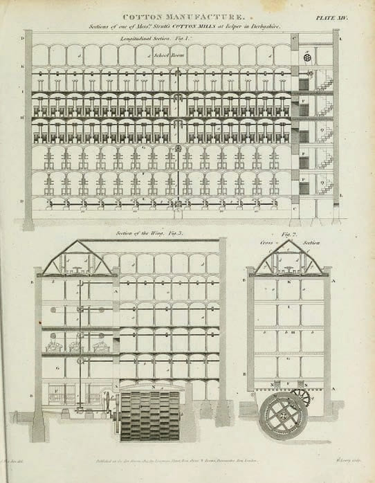 In contrast, vertical transportation (VT) of people in factories was promoted during the industrial revolution. The first description of such a system can be found in Abraham Rees’ Cyclopedia or Universal Dictionary of Arts, Sciences, and Literature, published in 1819, in which he describes the drive and control of a crane in the cotton mill operated by Henry Strutt in Belper, Derbyshire (central England), in 1803.[11] The crane was used to transport goods and workers up and down the factory building in a basket. In a more detailed description from a later volume, the basket is moved by a transmission driven by a mill wheel. According to Rees, this is “an extremely ingenious and useful machine, which is used by Mr. Strutts in all his cotton mills and is also used in many other manufactories.”