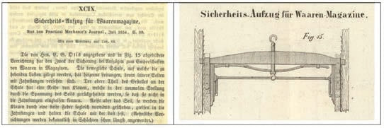 [14] D. Johann Gottfried Dingler, Polytechnisches Journal, Volume 133, No. XCIX, p. 415 “Security elevator for goods magazines” (1854).