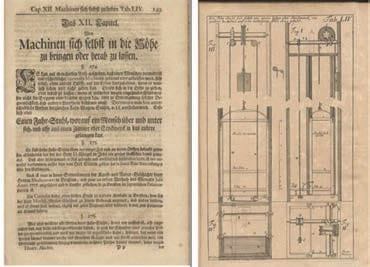 However, the transportation of people was limited to a few individual cases. The first reports on this can be found in Jacob Leupold’s book Theatrum Machinarium, published in 1725. Chapter XII “Machines to raise or lower themselves” reports on the “Fahr-Stuhl” (“Elevator”) of Mr. D. Weigel (1667) in Jena, Germany, which caused a “great sensation,” but of which there are unfortunately no records or descriptions. It also mentions a “chair” by the master model maker Gärthner from Dresden, Germany, which he used “daily with great comfort” both for going down and going up. Also of interest in this book are the description and illustration of a: