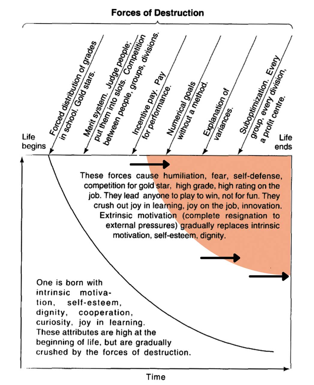 As you know from previous articles, one of my favourite management thinkers is a guy called Deming. In his book, The New Economics, he develops a diagram (page 122) that shows what he calls “the forces of destruction.” These forces rob people of creativity and innovation.