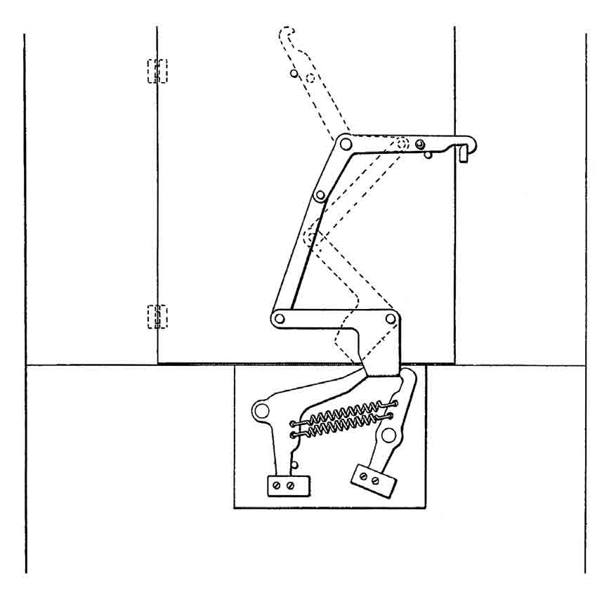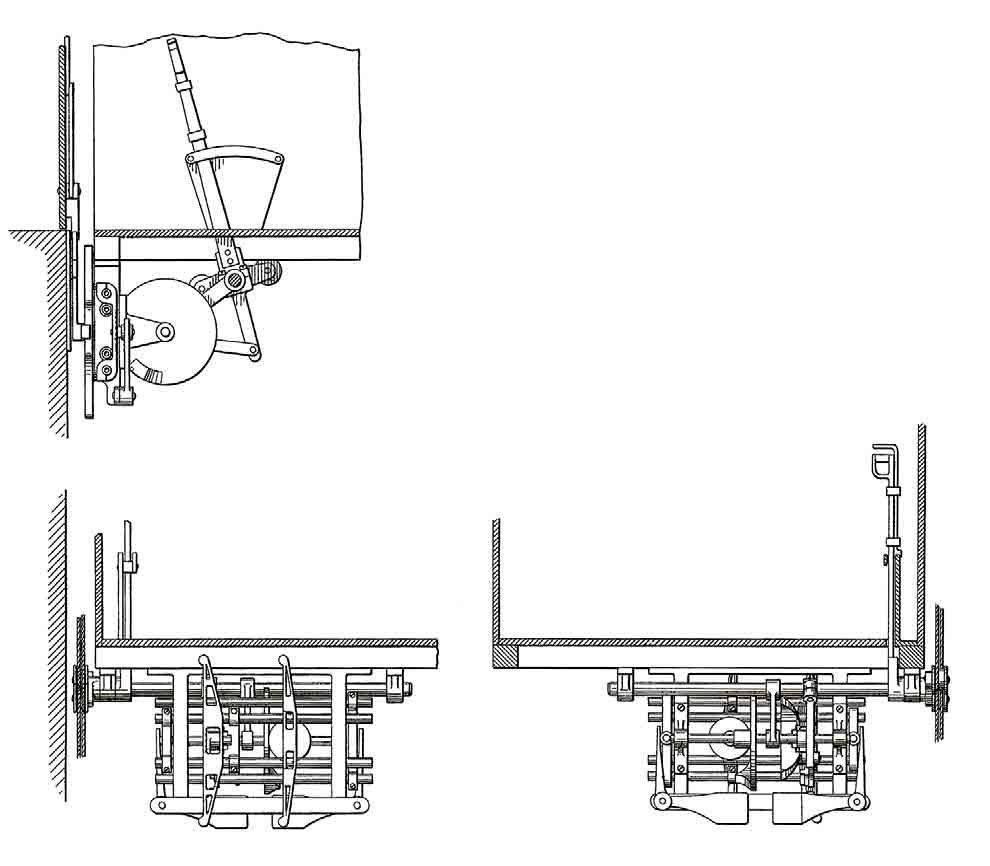 Ritter’s technical solution was almost as complex as his explanation. The lock locking mechanism, which would be released by the presence of the car, was the simplest component. A plate mounted below the door held a bell crank lever, which, when released, allowed the door locking levers to rotate such that the operator could open the door (Figure 1). The function of the lever opposite the bell crank lever is less obvious. It was intended to lock the car operating mechanism such that the car could not move while the door was open. This relatively simple mechanical operation was made possible by a complex mechanism located beneath the car (Figure 2). It featured a series of cams that engaged the shaft door levers. It was activated when the operator pulled the control lever to stop the car.