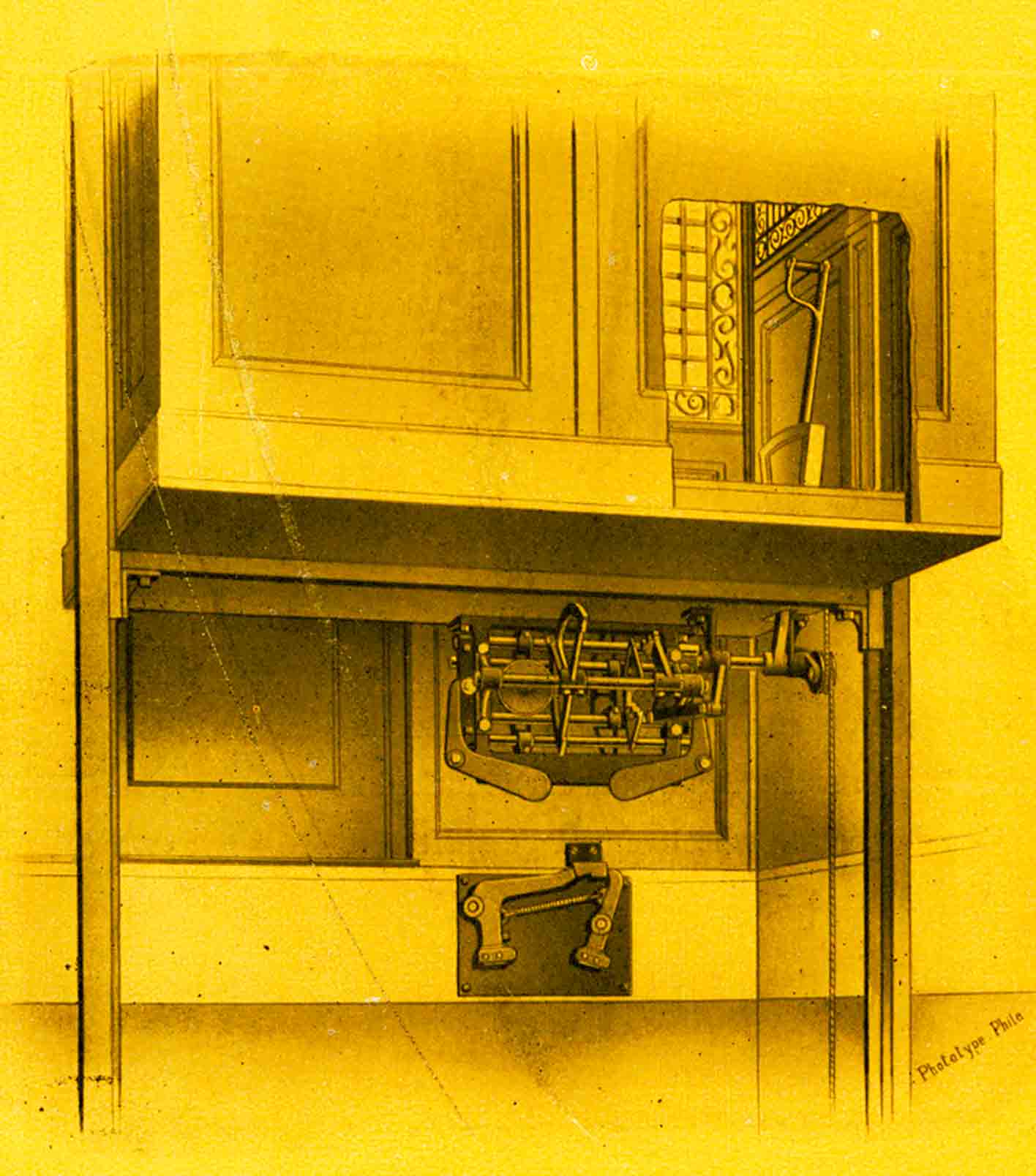 At this point in the history of similar overdesigned safety devices, the story would normally conclude, as the device appears to be too complicated to offer users a viable technical solution. However, in this instance, the inventor’s faith in his design, coupled with his possessing the means to manufacture the device, led to the production of the “Ritter Controller and Door Locking Device for Elevators.” Ritter’s marketing campaign included an illustrated catalog that extolled the technological virtues of his invention. The catalog drawings reveal that some, albeit limited, design development continued after the patent phase. One change was a simplification of the door lock. The mechanism was reduced to a simple bracket mounted on the bottom of the door that was engaged by the bell crank and straight levers (compare Figures 1 and 3). However, the core of the design, the mechanism located under the car, retained its complex mechanical scheme (Figures 4 and 5).