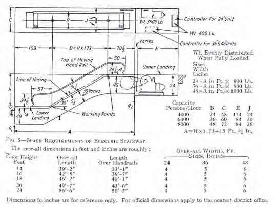 The Westinghouse Electric Stairway experienced continued commercial success throughout the 1930s. The Westinghouse General Catalog 1939-1940 referenced installations in Philadelphia; NYC; Chicago; Washington, D.C.; Los Angeles; Buffalo, New York; Camden, New Jersey; and Birmingham, Alabama; and Richmond, Virginia. The catalog claimed, “In development of the electric stairway, Westinghouse used principles proved in engineering practices.”[11] These “principles,” in the context of escalator design, included step treads with closely spaced cleats, ball bearings or roller bearings to minimize lubricating requirements, canvas step rollers (for quiet operation), and metal or wood balustrading.[11] The stairs were also described as “standardized in all important respects” with an operating speed of 90 ft/min and a 30° angle of incline. The stairs were available in three widths: 24 in. (4,000 people per hour), 36 in. (6,000 people per hour) and 48 in. (8,000 people per hour). The catalog included a schematic plan, section drawing and associated design data, all of which were intended to provide baseline information for architects and engineers (Figure 3).