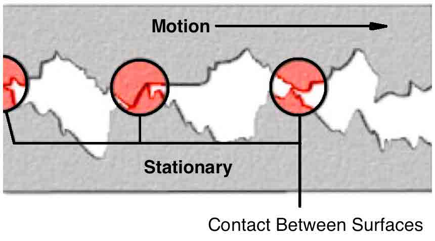The presence of contaminants and lubricants affects how the friction relationship of the surfaces will behave. Think of a rubber tire on the road again: on a dry road surface, there is higher friction, but if oil is present, there is lower friction, because the voids in the asperities fill up, and the oils can create rolling balls of liquid, eliminating the locked nature of the asperities.