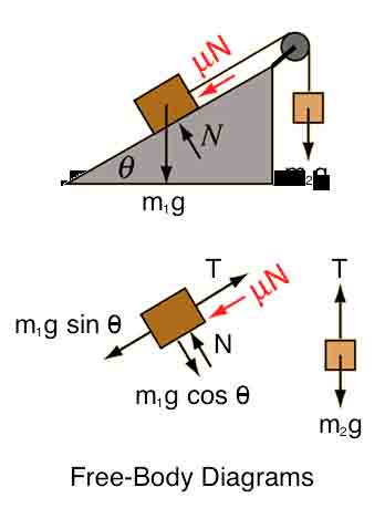 Developing a value for the coefficient of friction is simply illustrated with the inclined plane and its free-body drawing underneath (Figure 2). The surface of the inclined plane is one material, and the sliding box is another. It is counterweighted in this experiment to control the forces of movement.