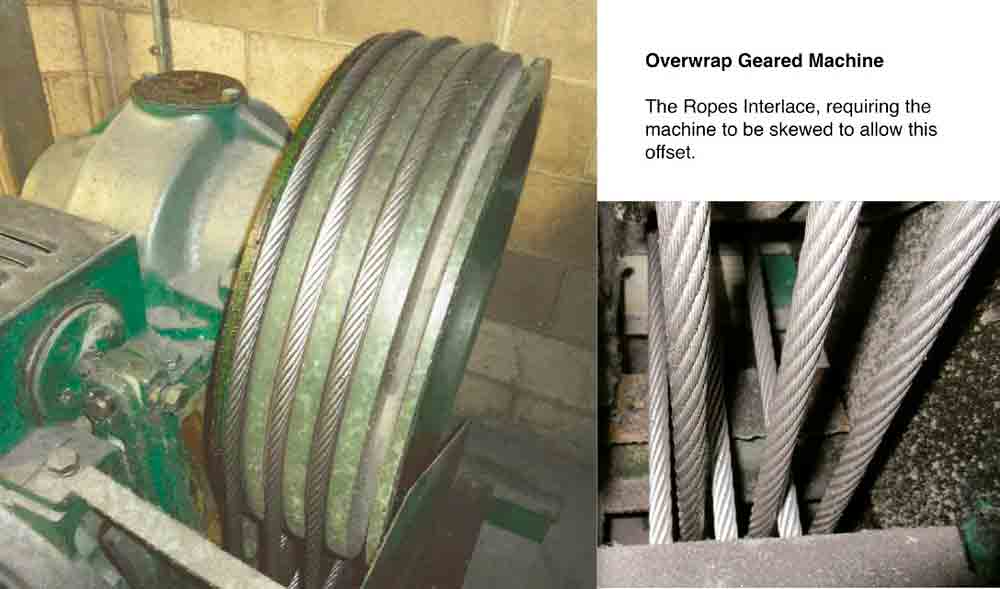 Finally, the tractive force is fully described as a value when the groove profile is established. With a µ that doesn’t change, the angle of wrap can be increased, but only to a point. In one design, the rope wraps over 270°, and the ropes interlace (Figure 3). This novel Otis long-wrap traction (LWT) design appears to introduce a slight fleet angle and the appearance of a reverse bend, both of which can have negative effects on steel-wire ropes. More accurately, fleet angle is caused by the location of the furthest rope shackle at its car hitch-point location with respect to the corresponding location of the rope groove at the machine.  There will be both forward and side draw in the LWT design, and it varies from one rope to the other.  Side draw causes wear of one side of the groove more than the other and leads to a reduction of available traction in the grooves. The skewing of the ropes in the LWT arrangement cause groove side wear in the sheave grooves. While it cannot be eliminated, it can be controlled.  Major manufacturers have in-house limits on the amount of forward and/or side draw.