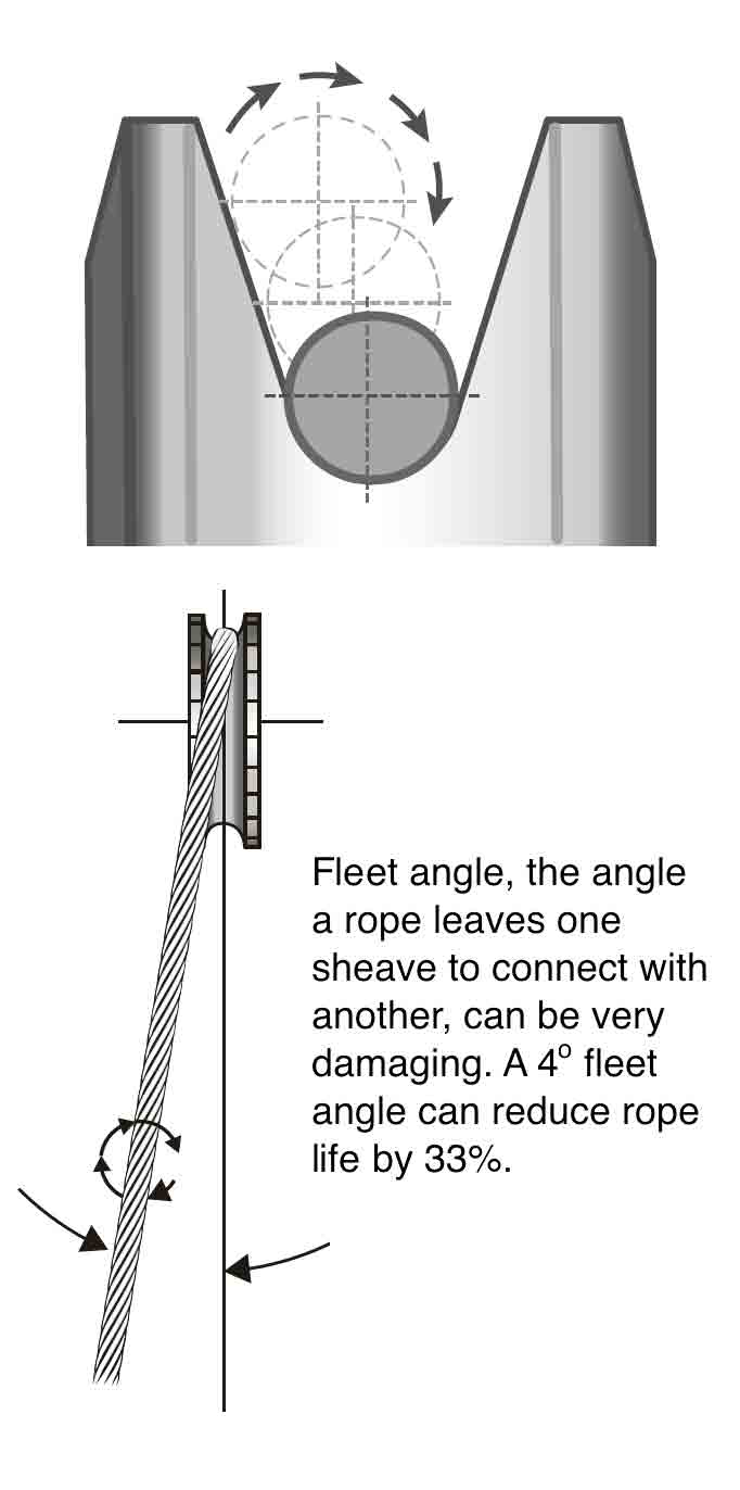 Fleet angle (Figure 4) causes a torque in a rope, winding the rope tighter on one side, and unwinding the rope on the other side. Additionally, it adds an abrasion to the sheave and rope, reducing their lives. When constructing an electric elevator, care must be taken to ensure no significant fleet angle exists.