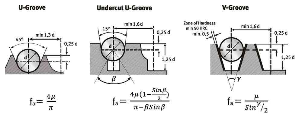When the required traction exceeds the available traction on a U-groove sheave (for example, when you cannot increase the angle of wrap), the grooves can be modified, and the increased specific pressures provide higher available traction. The resulting extra traction has tradeoffs that go beyond this article; however, the typical grooves, their related traction formulae and their related apparent coefficients of friction are shown in Figure 5. All mechanics and technicians should have some idea of this material so that when reordering rope, basic knowledge will ensure the incorrect rope is not installed, leading to reduced rope and sheave life.
