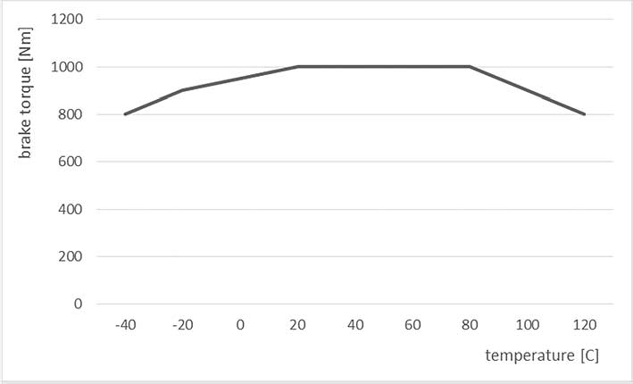 Holding the elevator in position requires a certain static torque. Such torques must be provided under all ambient conditions and over time. The static torque will be influenced from cold or high temperatures. The ambient temperature plus smaller drives lead to a higher temperature than in the past. The high temperature may have some effect on the friction coefficient. Figure 2 shows that conventional friction lining can lose its friction coefficient at high temperature. The brake manufacturer has to develop a brake lining for high temperatures.