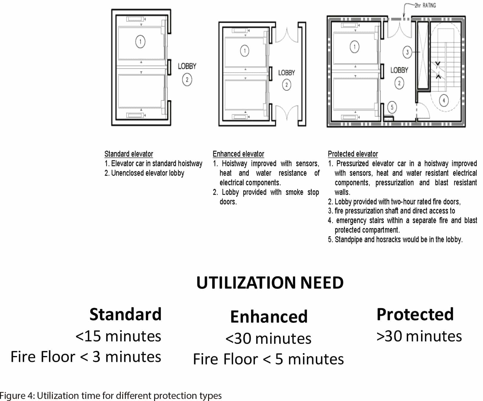 The CTBUH guideline described three different types of evacuation and three protection levels for elevators. The three evacuation types can be found in Figure 2, while the three elevator protection levels are shown in Figure 3. What is not, however, described by the CTBUH guideline is how to link the elevator protection level to the different evacuation types. It should, however, be clear to anyone that the greater the risk for the user, the higher the protection level of the elevator should be to prevent user safety risks during evacuation.