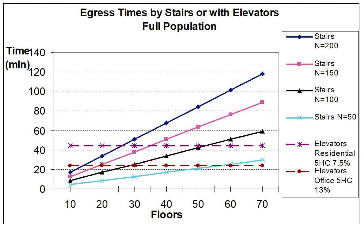 A building with an average floor population of 150 persons per floor (N = 150) will be evacuated faster by elevators than by stairs if the number of floors exceeds 20. The larger the population per floor, the lower the height at which the tipping point will occur to make elevators faster than stairs. This point for residential buildings with lower population densities per floor are clearly much higher than for office buildings. With an N value of 50 persons per floor, the number of floors must exceed 70 before elevators will evacuate faster than stairs. Stairs will normally always be faster, of course, except for those not capable or fit enough to walk the stairs.