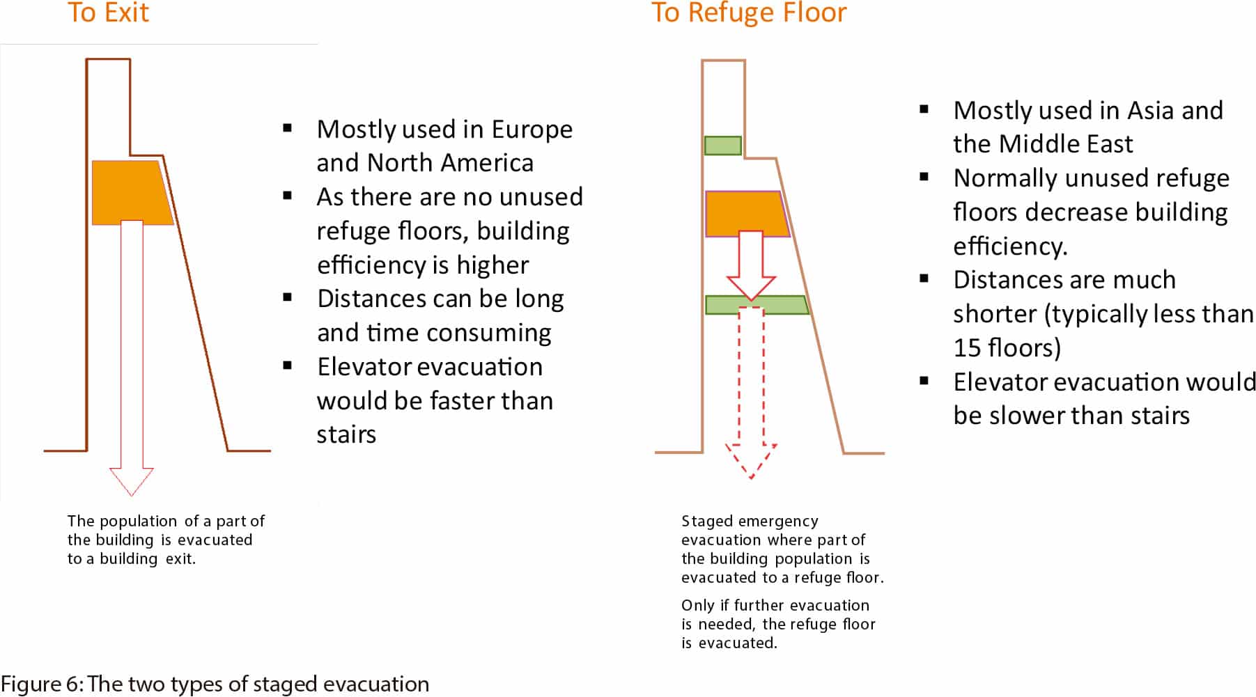 There are typically two types of staged evacuation for high-rise buildings (Figure 9). In Europe and North America, one mostly finds the first type, “To Exit.” This system provides a higher building efficiency, as no unoccupied refuge floors are used. Distances to the exit can be long, depending on the height of the floor(s) needing evacuation. Elevator evacuation can often be faster than evacuation by stairs. Staged evacuation should be considered here.
