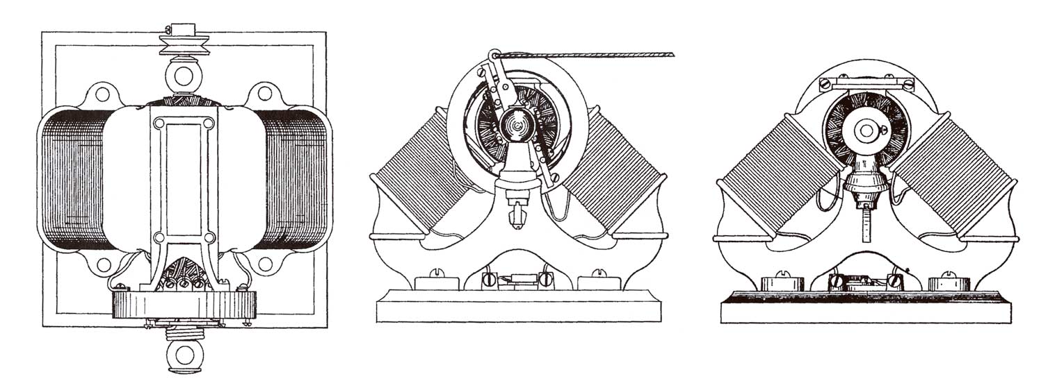 - Figure 3: Baxter Electric Motor: (l-r) top, front and rear views (drawings derived from “Electric Motor,” U.S. Patent No. 361,115 (April 2, 1887))